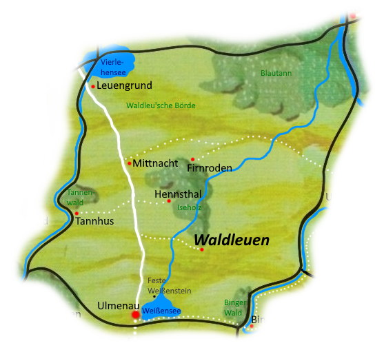 Waldleuen ist ein Land voller Geheimnisse, mystischer Orte und Gegensätze. Vom düsteren Blautann, der von Hexenzirkeln, einem mächtigen Höhlendrachen und sonstigem Übel wollendem Viehzeug bewohnt wird, hin zum wildreichen Iseholz, dem bevorzugten Jagdgebiet der Herzoge Weidens . Von der fruchtbaren Börde hin zum Hennsthal und vom fischreichen Vierlehensee bis hin zum funkelnden, Männer verschluckenden Weißensee --- überall finden sich Stätten der Mystik und der Magie.