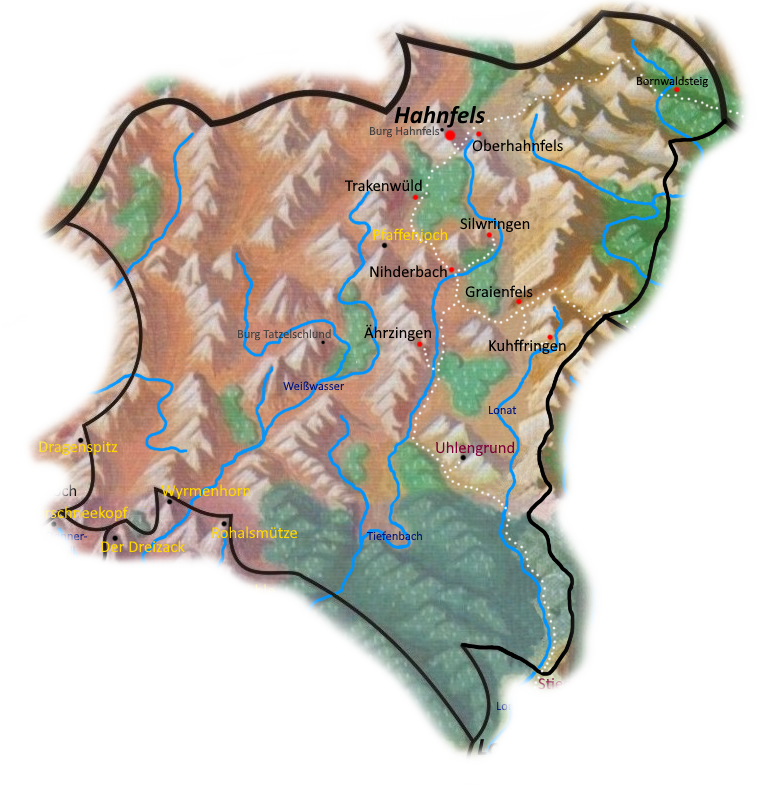 | Baronssitz: | Eigentlich Hahnfels, doch Mirnhilde hat sich mit ihren Getreuen nach Burg Tatzelschlund zurückgezogen |