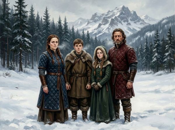 Die Familie der Ritterin von Pergelgrund, v.l.n.r. Aerin Blaubinge, ihr Erbe Bogumil, die zweitgeborene Tochter Madalena und Hainrich von Gugelforst