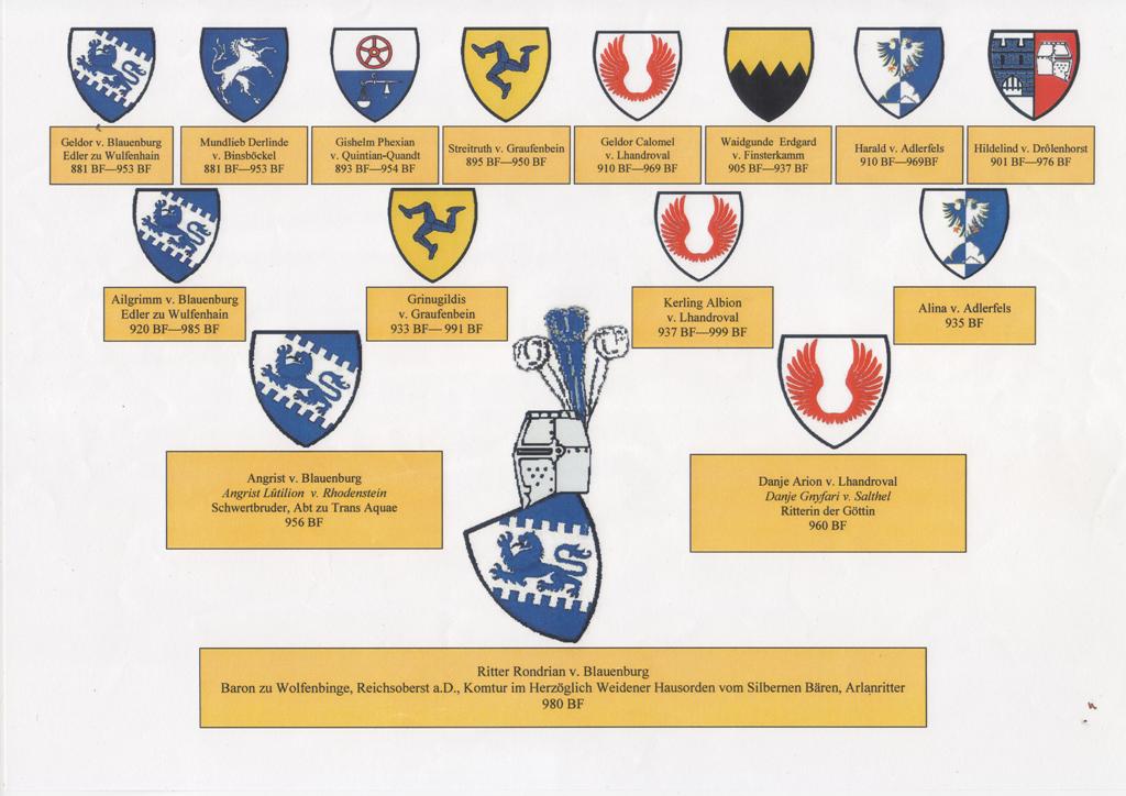 Geron Leomir – versessen vom Gedanken einer glorreichen Familie – hatte derweil so manchen Rhodensteiner Kriegschronisten auf unübliche Questen geschickt und in Erfahrung bringen lassen, welche Mitglieder der einzelnen Familienzweige derzeit immer mal wieder in Erscheinung treten.
