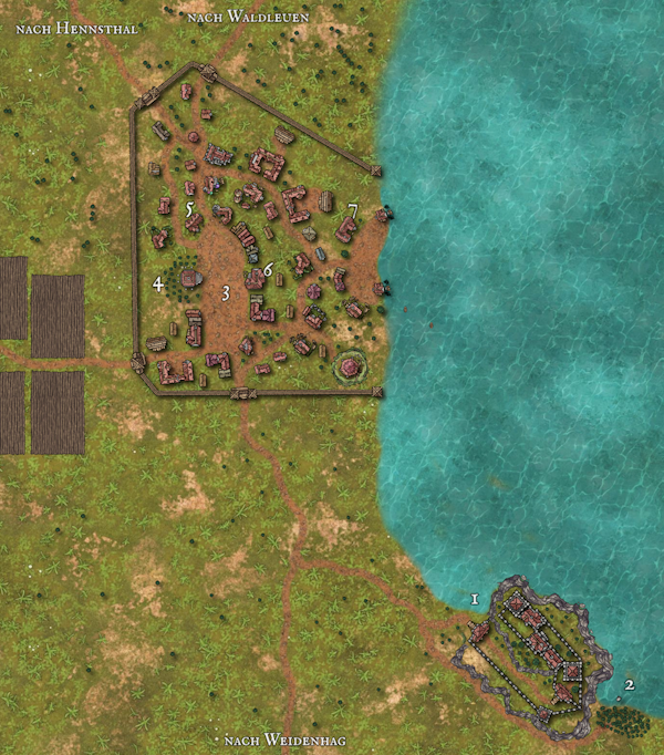 Der größte Ort der Baronie liegt am wichtigen Hagweg und wurde von der Herzogin mit dem Marktrecht bedacht. Hier werden die bescheidenen Güter der Waldleuener Lande umgeschlagen - seien dies Jagdwaffen, Tran, Talg oder Wollerzeugnisse. Den Mittelpunkt des Dorfes bildet der Markplatz (3) mit der Schenke “Schwarzes Einhorn” (6) (Q5/P3/S12). Etwas billiger an Speis und Trank kommt man im “Silbernen Kapfen” (7) (Q2/P2/S6) am Seeufer. Hier schmeckt das Bier schal und der Eintopf wie von Vorgestern, doch besticht das Etablissement durch den schönen Blick auf den funkelnden See.