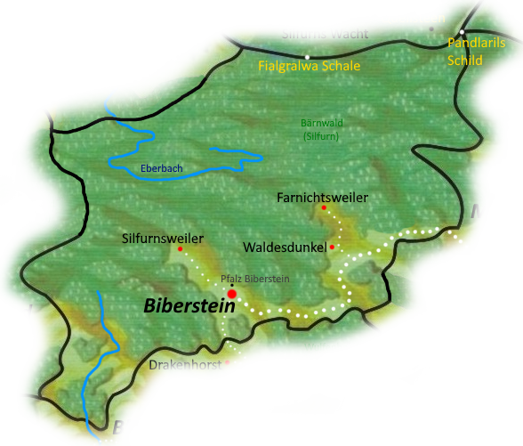 Tief im finsteren Bärnwald findet sich nicht nur eine der kleinsten kaiserlichen Pfalzen des Reiches, sondern auch eine der Einzigartigsten. Biberstein stellte in der Zeit nach der Landnahme Isegreins einen Ort der Freundschaft zwischen dem Alten Volk und den Menschen dar. Hier wurde Handel getrieben und getauscht. Die Unantastbarkeit der Lande, der hier ansässigen Mond-über-den-Seen Sippe wurde gar vertraglich fest verankert. Kaiser Raul der Große, als erster der Klugen Kaiser, soll diesen besonderen Ort 24 BF zur kaiserlichen Pfalz erhoben haben und noch heute zeigen sich die vielen elfischen Einflüsse an ihren Gebäuden.
