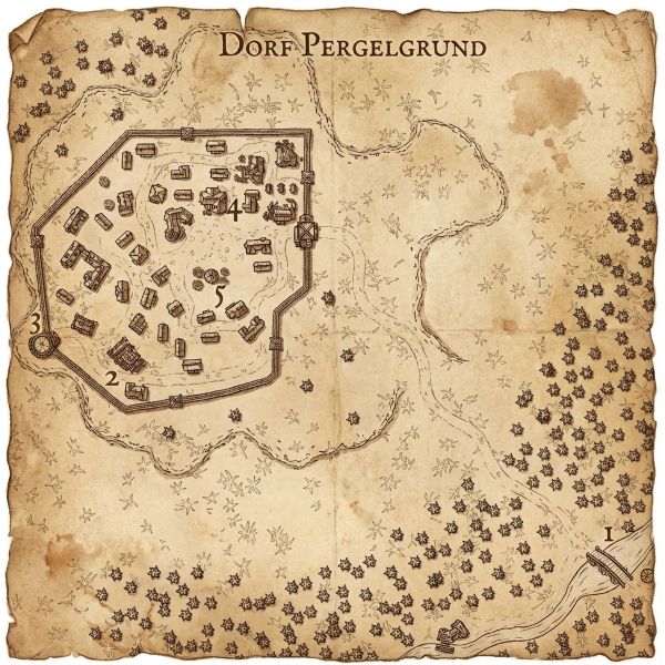 Umgeben wird das strategisch gut liegende Dorf, welches sich unweit der blutroten Furt (1) über den Pergelbach liegt, von einer hölzernen Palisade, welche nach den Zerstörungen des letzten Orkkrieges soeben wieder fertig gestellt wurde. Innerhalb der Palisaden findet man die 15-20 Gehöfte, Ställe und Kräutergärten der ansässigen Bauern und Viehzüchter. Die Hütten sind allesamt roh gezimmert, machen jedoch einen rüstigen Eindruck. Am höchsten Punkt des Dorfes befindet sich der Familiensitz der Ritter von Pergelgrund (2), welcher das größte Gebäude des Dorfes darstellt.