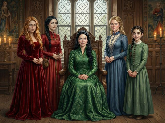 Die Zofe Dÿlga vom Blautann und ihre zukünftige Schwiegertochter Heimgard von Silkenau folgen ihr wie ein Schatten.