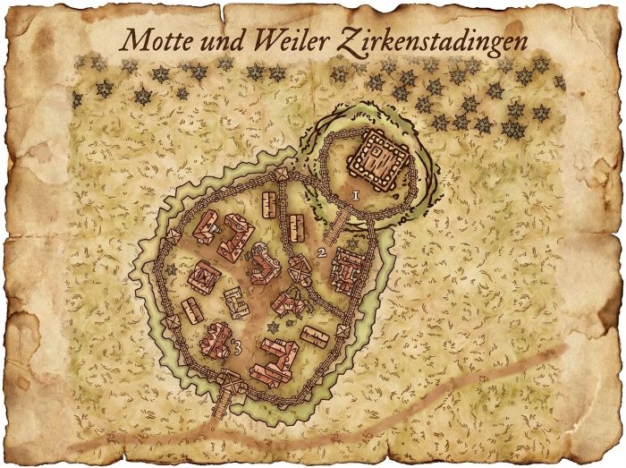 Zirkenstadingen ist ein typisches Rittergut, wie man es in Weiden sehr häufig finden mag. Den Mittelpunkt bietet hierbei eine hölzerne Motte (1) auf einer künstlichen Erhebung. Umgeben wird die Siedlung von einer rüstigen Holzpalisade und einem künstlich angelegten Graben. Der Ritter bewohnt ein befestigtes Gutshaus (2) am Fuße des Mottenhügels.