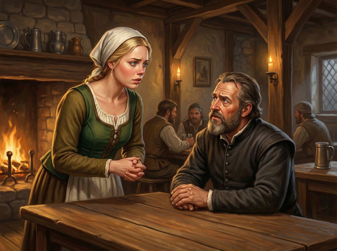 Erst das Ächzen der Tür ließ sie aufblicken und riss sie aus ihren trüben Gedanken. Ein dunkel gekleideter Mann trat ein und setzte sich an den Tisch nahe des wärmenden Feuers. Der wohl wieder einsetzende Regen hing ihm in Tropfen aus dem Bart, und sein grober Wollmantel hatte die Farbe von nassem Staub und Dreck. Siltja wischte sich die Hände an der Schürze ab und musterte ihn mit einer Mischung aus Neugier und Vorsicht.