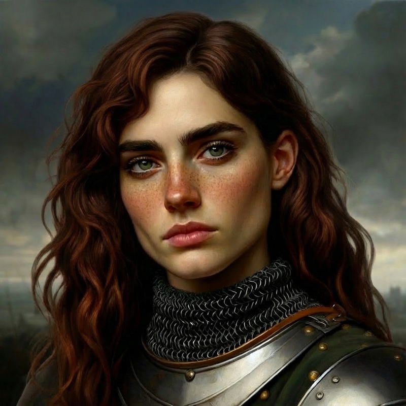 | Kurzprofil: | *1021 BF, 1,72 Schritt, grüne Augen, Sommersprossen, rotbraunes Haar, starke Brauen und ein starkes Kinn, stabil gebaut; kompetente Ritterin, eher zurückhaltend und wortkarg, aber dennoch mit einem entspannten, unaufdringlichen Selbstbewusstsein gesegnet, bodenständig und in sich ruhend, dabei fast so stur wie ihre schlechtere Hälfte, aber deutlich konfliktscheuer und weniger vertrauensselig. |