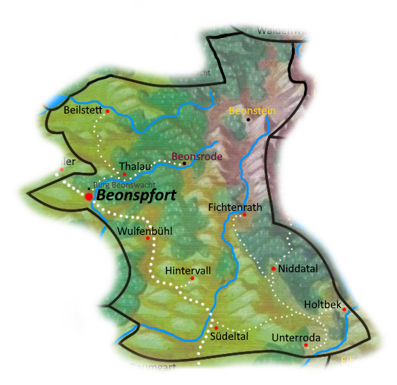 Beonspfort liegt in den westlichen Ausläufern der Roten Sichel und wird gern auch mal als das Tor zum Gebirge bezeichnet. Eine wichtige und eine praktische Route kreuzen das Lehnsland der Wolkensteinerin: Der Salzweg, eine gut ausgebaute Straße, zweigt in Herzoglich Altentrallop vom Alten Weg zwischen Trallop und Rathila ab --- er führt von hier aus durch das Hinterland nach Salthel, genau wie die Reichsstraße 2, aber etwas kürzer und weniger frequentiert. Vom Salzweg zweigt bei Tannengrund der Hagweg ab, ein einfacher, schmaler Pfad, der bis nach Runhag führt.