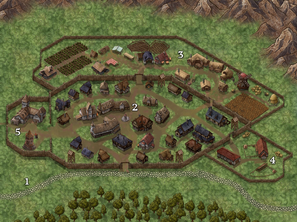 Efferdwärts des Dorfes befindet sich das kleine Gutshaus des Ritters, welches sowohl durch eine eigene Holzpalisade, als auch einem eigenen Wehrturm eine solide Befestigung bildet. Der Drakturm (5) ist mit seinen über zwanzig Schritt das höchste Gebäude des kleinen Dorfes.
